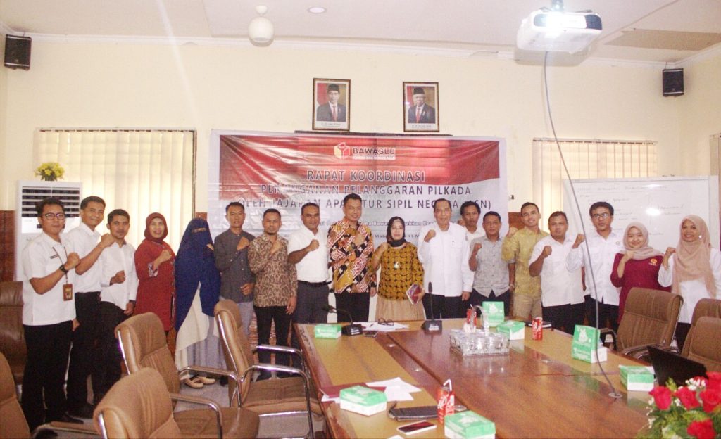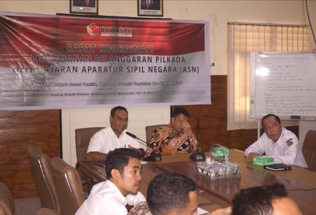 BAWASLU NTB, Mataram - Komisi Aparatur Sipil Negara (KASN) dan Badan Pengawas Pemilu (Bawaslu) Provinsi NTB bersinergi dengan melaksanakan rapat koordinasi penanganan pelanggaran pilkada oleh jajaran aparatur sipil negara (ASN) untuk tingkatkan efektivitas penanganan pelanggaran netralitas ASN dalam pelaksanaan pemilihan kepala daerah serentak tahun 2020, di ruang rapat kantor bawaslu NTB. Rabu, (11/3/2020).