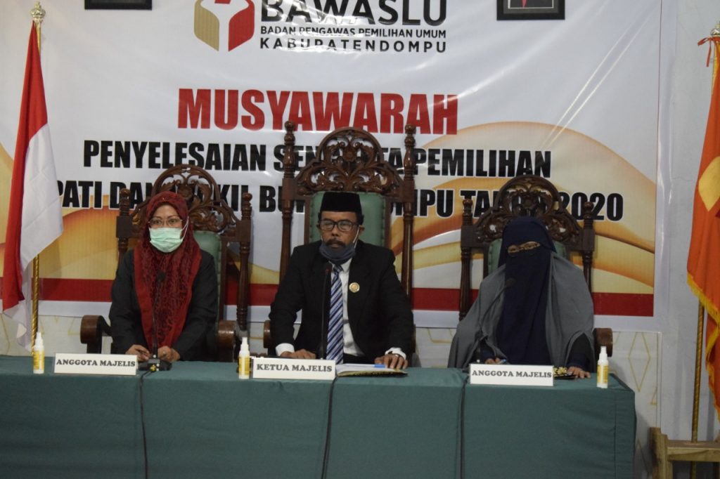 “Bawaslu Kabupaten Dompu meminta KPU setempat untuk membatalkan berita acara hasil penelitian perbaikan persyaratan calon tertanggal 22 September 2020 dan surat keputusan nomor: 92/HK.03.1-Kpt/5205/KPUKab/IX/2020 tentang penetapan pasangan calon (paslon) peserta pilkada 2020 di Dompu,†ungkap Ketua Bawaslu Dompu yang juga sebagai Ketua majelis sidang, di Ruang Sidang Bawaslu Dompu, NTB, Sabtu (10/10/2020).