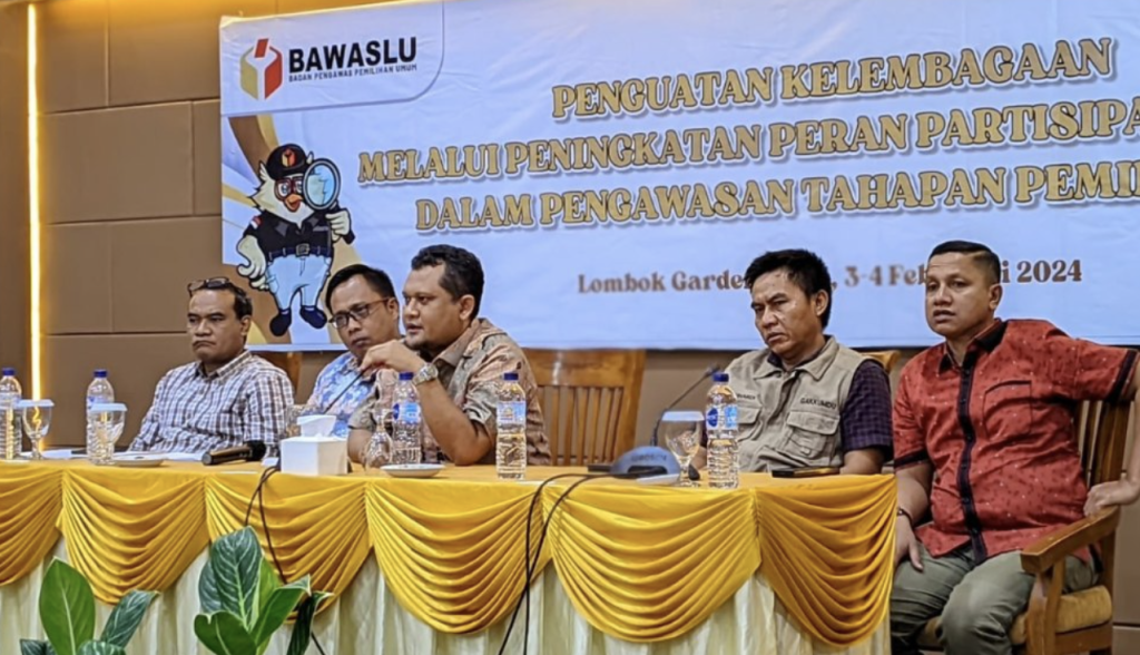 Ketua dan Anggota Bawaslu NTB daalam kegiatan Penguatan Kelembagaan Melaluai Peningkatan Peran Partisipatif Media dalam Pengawasan Tahapan Pemilu Tahun 2024 di Hotel Lombok Garden pada Sabtu-Minggu (03/02/2024).