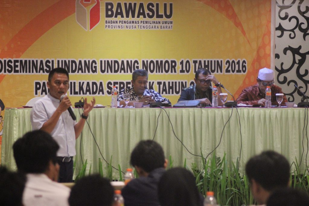 BAWASLU NTB, MATARAM-Badan Pengawas Pemilu (Bawaslu) Provinsi Nusa Tenggara Barat mengadakan diskusi Diseminasi undang-undang nomor 10 tahun 2016 pada pilkada serentak tahun 2020 bekerjasama dengan Mahasiswa Fakultas Hukum Universitas Mataram (Unram) di Hotel Lombok Plaza Mataram, Jum’at (06/12/2019).
