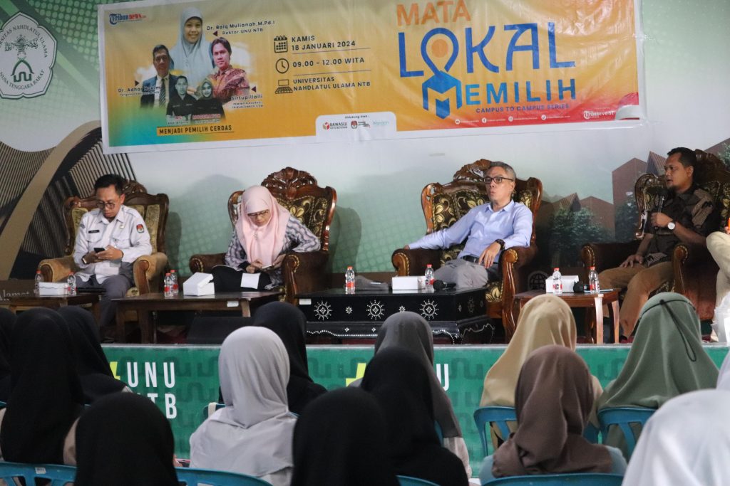 Ketua Bawaslu NTB, Itratip, (Batik Coklat dari Kiri ) saat hadir sebagai narasumber pada Kegiatan Mata Lokal Memilih di Kampus Universitas Nahdatul Ulama (UNU) NTB kamis, ( 18/01/2024)/Poto Humas Bawaslu NTB