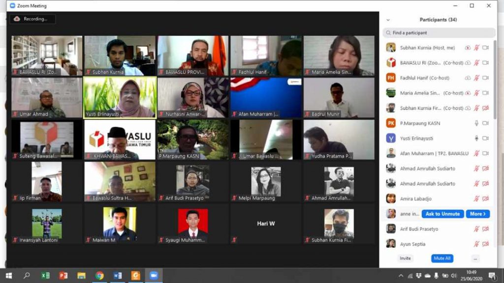BAWASLU NTB, Mataram - Anggota Bawaslu Provinsi NTB, selaku Koordiv. Penanganan Pelanggaran Umar Achmad Seth, SH. MH terundang menghadiri Focus Group Discussion (FGD) secara daring melalui aplikasi zoom. Adapun tema yang diangkat yaitu tentang Penanganan Pelanggaran Netralitas Aparatur Sipil Negara (ASN) bersama Komisi Aparatur Sipil Negara (KASN) yang diadakan oleh Bawaslu RI dan jajaran Bawaslu Provinsi terundang, Kamis (25/06/2020).