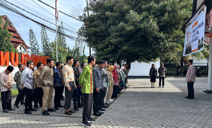 Suasana Kegiatan apel pagi dalam rangka Pencanangan Rangkaian HUT Bawaslu ke-16 pada Senin (25/3) di halaman sekretariat Bawaslu NTB.