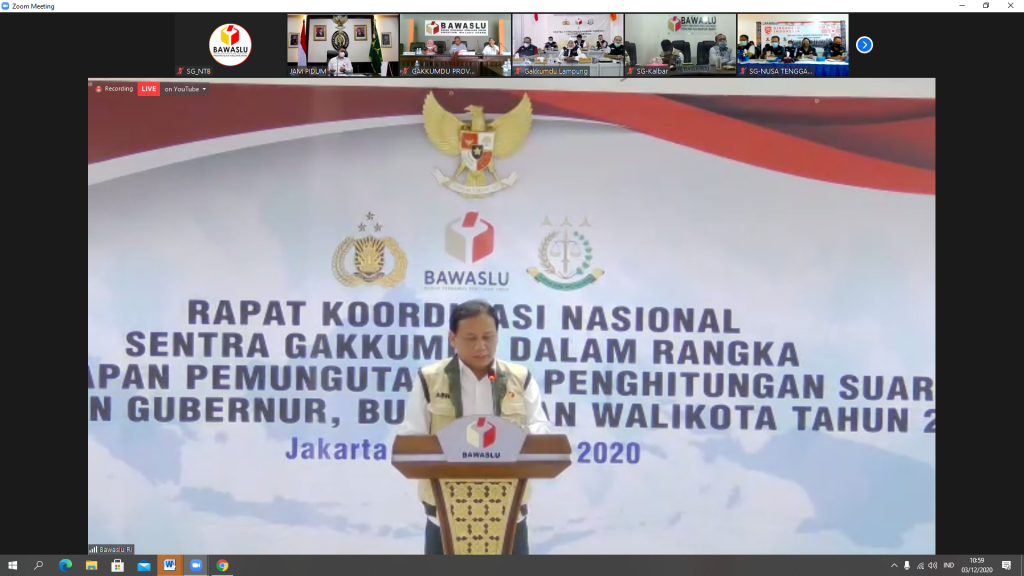 Rakornas tersebut secara khusus membahas berbagai potensi pelanggaran tindak pidana pemilihan pada tahapan pemungutan dan penghitungan suara serta rekapituasi hasil pemilihan, yang diikukti oleh Sentra Gakkumdu Provinsi seluruh Indoonesia. Pimpinan Bawaslu RI/Kordiv Penindakan Pelanggaran Dr. Ratna Dewi Petalolo, SH., MH. Menyampaikan jumlah leporan/temuan dugaan pelanggaran Pilkada 2020 dari seluruh daerah sebanyak 3.814, dan sebanyak 104 diantaranya termasuk dugaan pelanggaran tindak pidana pemilihan.