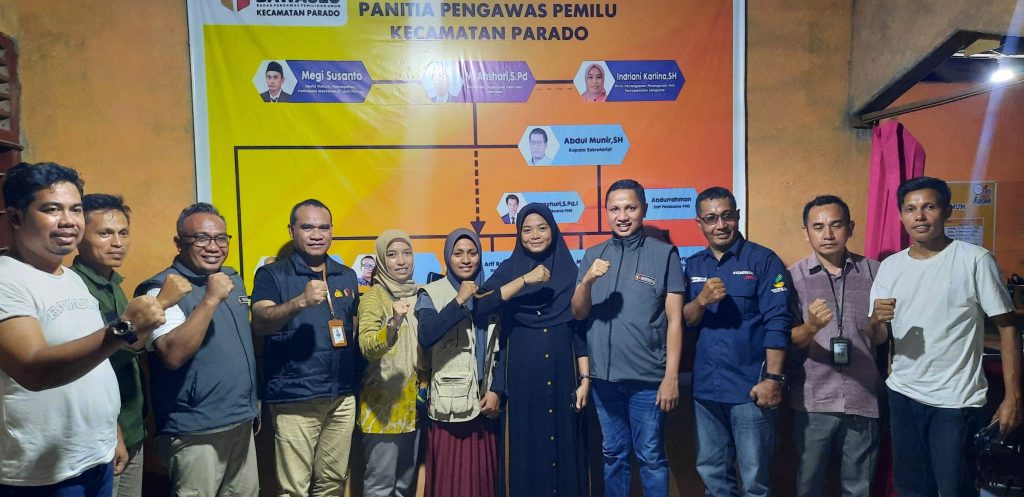 Anggota Bawaslu NTB Hasan Basri dan Umar Achmad Seth poto bersama Jajaran Bawaslu Kabupaten Bima dan Panwascam Kecamatan Parado pada Jum'at (23/02/2024).