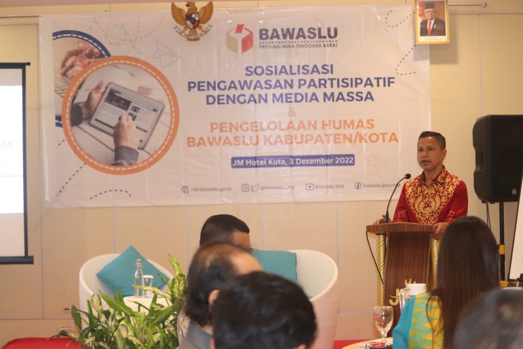 Koordinator Devisi Pencegahan, Parmas, dan Humas Badan Pengawas Pemilihan Umum (Bawaslu) NTB, Hasan Basri saat membuka Sosialisasi Pengawasan Partispatif dengan Media Massa dan Pengelolaan Humas Kabupaten Kota dihadiri seluruh Bawaslu se NTB berlangsung di Kuta Pujut Lombok Tengah Sabtu, 03/12/22.