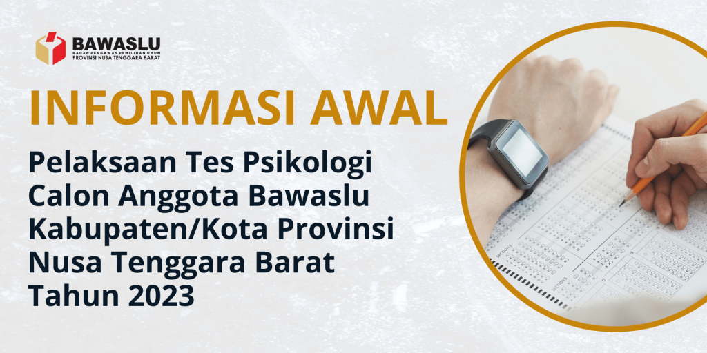 Sehubungan dengan pelaksanaan tes psikologi bagi calon anggota Bawaslu Kabupaten/Kota se-Provinsi NTB tahun 2023, maka Tim Seleksi menyampaikan beberapa hal sebagai informasi awal pelaksaan tes tersebut.