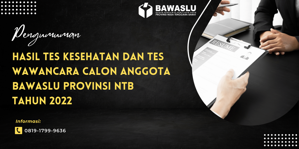 Dalam rangka melaksanakan amanat Undang-Undang Nomor 7 Tahun 2017 tentang Pemilihan Umum, setelah melakukan penilaian terhadap hasil Tes Kesehatan dan Tes Wawancara, bersama ini diumumkan nama -nama Calon Anggota Bawaslu Provinsi Nusa Tenggara Barat yang lulus Tes Kesehatan dan Tes Wawancara. Pengumuman dapat diunduh melalui tautan berikut: