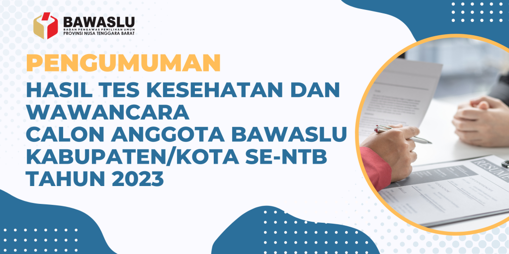 Dalam rangka melaksanakan amanat Undang – Undang Nomor 7 Tahun 2017 tentang Pemilihan Umum, setelah melakukan penilaian atas Tes Kesehatan dan Tes Wawacara Calon Anggota Bawaslu Kabupaten/Kota se-Pulau Sumbawa (Zona 2). Bersama ini Tim Seleksi mengumumkan nama-nama yang lulus seleksi Tes Kesehatan dan Tes Wawancara Calon Anggota Bawaslu Kabupaten/Kota sebagaimana terlampir dalam pengumuman berikut.