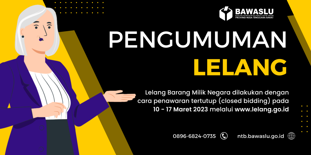 Bawaslu Provinsi Nusa Tenggara Barat melalui perantara Kantor Pelayanan Kekayaan Negara dan Lelang (KPKNL) Bima akan melakukan penjualan secara umum (lelang) terhadap Barang Milik Negara.