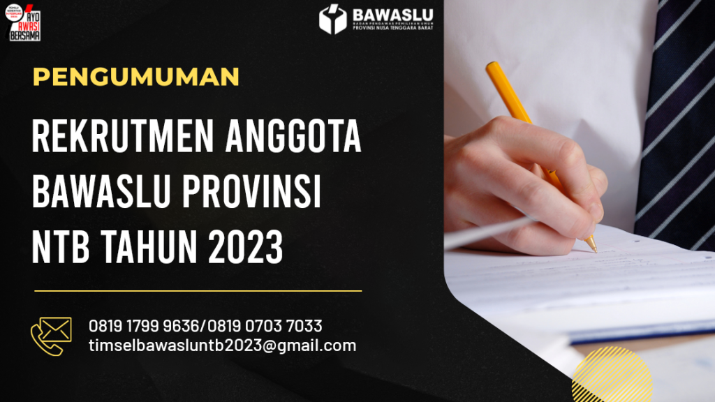 Dalam rangka pembentukan Bawaslu Provinsi Nusa Tenggara Barat, maka Tim Seleksi Calon Anggota Bawaslu Provinsi Provinsi Nusa Tenggara Barat berdasarkan Keputusan Bawaslu Nomor: 1380.03.1/HK.01.01/K1/03/2023 atas kewenangan yang diberikan oleh Undang- Undang Nomor 7 Tahun 2017 tentang Pemilihan Umum membuka kesempatan bagi Warga Negara Indonesia yang memenuhi persyaratan untuk mendaftarkan diri sebagai calon anggota Bawaslu Provinsi Nusa Tenggara Barat.